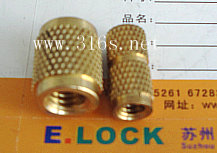 位于左圖右面的熱壓式銅鑲件螺母含有網紋及直紋,外圓呈錐形,在熱壓的過程中以利于順利導入塑膠孔內. |